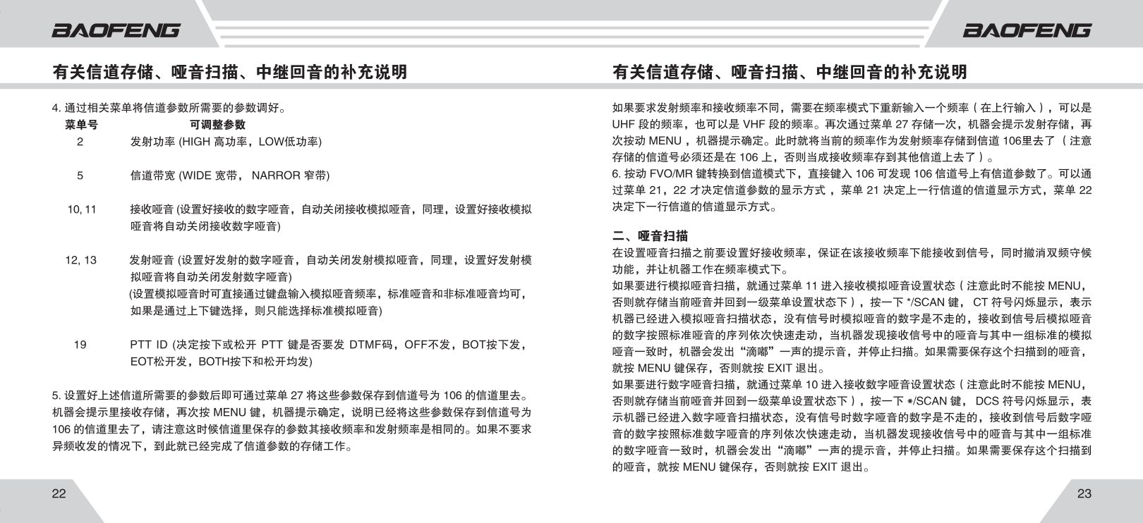 数字哑音(DCS):附加一组 数字编码信号(D023N ~ D754I(共104组编码)),适用于专业通讯、抗干扰要求高的环境