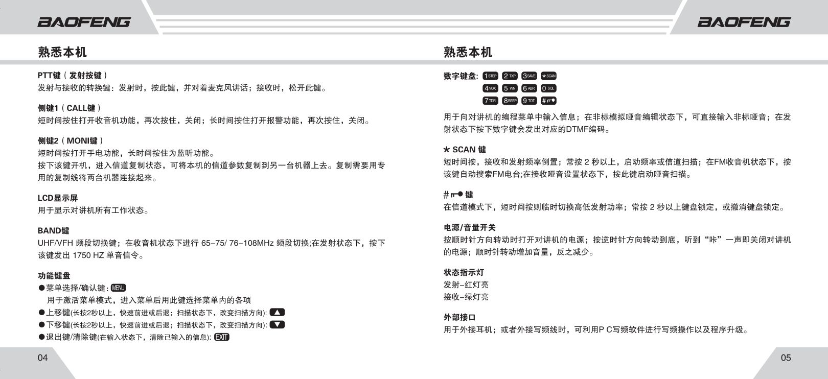 VFO/MR(橙色):频率/信道模式切换(频率模式用于手动调频,信道模式调用预设频道)